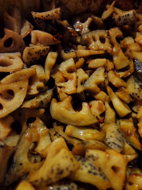 あぁ、れんこんのきんぴら、当店ではスライスにしないで、こうしてたべやすい大きさにざっくばらん!のざく切りがイイネ!シャキシャキしっかりした食感に、鷹の爪でほんのりピリリと甘辛たれを絡ませて、ごはんにヨシ、もちろんつまみにもヨシ!言うことナシ!(笑)(お)