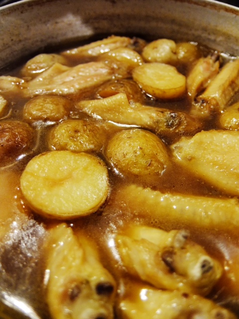 さてさて冷たい雨の夜ですねと、あったか煮物はほっくり新じゃがと鶏手羽先の旨味がいっぱい!…ごはんにヨシ!お酒にヨシ!と、ーざっくり大鍋でみなさんのご注文をお待ちしておるわけでございますな!ぜひぜひ〜!(お)