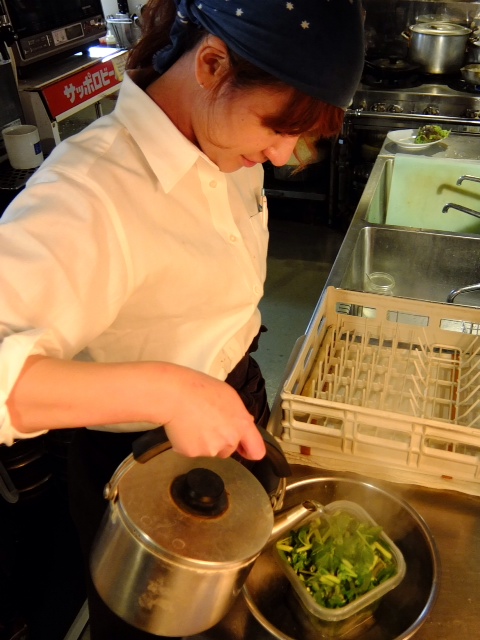 それからそれから。すっかりメニューのメインを担っております春野菜…そんな中でもぴりりと小さな春の人気者と言えば「花わさびのしょうゆ漬け」…あんまり人気でほとんど毎日仕込んでおりますが、こうやってタッパに入れて、熱湯かけて、タッパごと氷水で冷やして…ってなプロセスがいつも不思議でなんとなく愉快だなと、毎度思うワタクシです(笑)。(お)