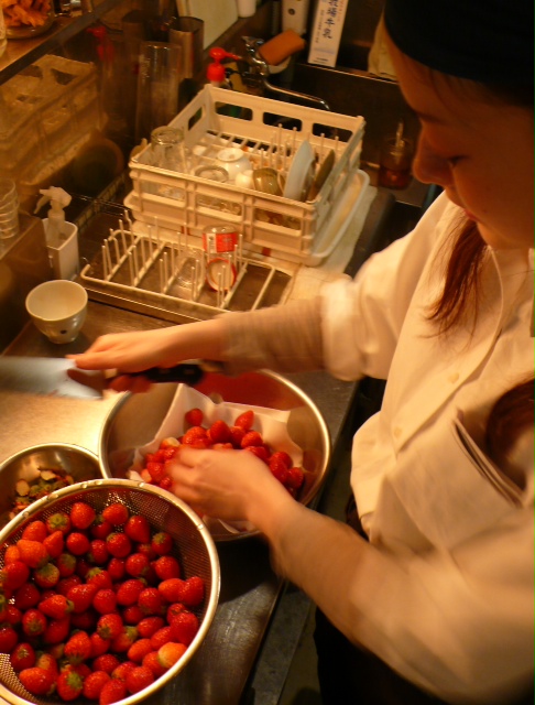 あぁ、桜の開花宣言も出て、すっかり春爛漫!お隣果物屋は一富士さん店頭には、ざくざく小さな露地物いちご…実にいちごらしい酸味と風味、もちろんそのおいしさは「いちごのババロア」にもなるし、今回は「ミックスフルーツ酢」にもなりますよ!冷たい水できゅっと洗って仕込みましょう!(ささぽんが…笑)(お)