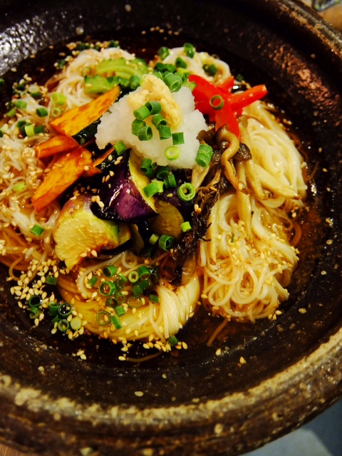 いや、くるりくるりとひと口サイズにまとめた素麺の上に茄子にかぼちゃ、パプリカなどなど、夏野菜を揚げたてあつあつのっけ盛り!やさしい味のだし汁と大根おろしにピリリとおろし生姜がアクセント!今夜ツルツルまいりましょう!(お)