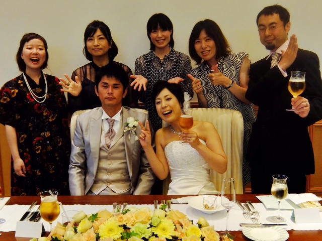 さてさて、式披露宴もしあわせなうちに終わりまして、えぇ、今、式場の送迎バスの中、いろんな感慨、ひたひたとうれしい余韻の中におりますワタクシであります。 今回くろちゃんの結婚式にお呼ばれしたのはワタクシドモオーナー夫婦に、くろちゃんの親友ぬまっちにまあこさん、高田ねぇさんでありました!…あー、いい式だったな〜。(お)