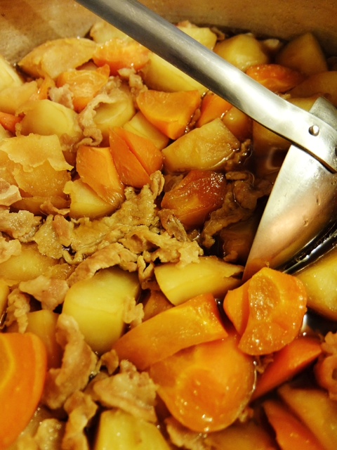 大鍋から何やら美味しそうなにおいが…鼻の下を伸ばして?確認すると ほっこり肉じゃががたっぷり!じゃがいもの表面は少しだけ煮崩れて、人参の甘み、 豚肉の旨味を吸い込んでよーく馴染んでいる!シミシミではないか!!っっこ、これはっ美味しいに決まってる!!て思ったら、お通しとして仕込んだようです。ぜ・い・た・く♡甘辛い味付けでお酒も進みそうですね〜♡タイミングがよければ、お出しするかも?ぜひご賞味くださいませ!(さ)