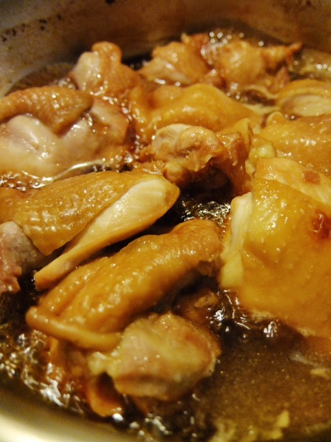 あららと、気がつけばコンロの上の鍋の中、なにやらおいしそうなものが煮えておりますな!と、えぇ、小さな夜メニューは「鶏肉のにんにく煮」!あぁ、実にすてき、ちょこちょこ酒の肴盛り合わせでもお召し上がりいただけますよ〜!…あー、ホントおいしそう(笑)。(お)