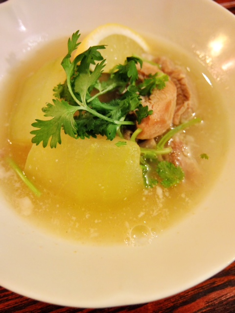 あー、夏の終わりから秋のはじめ、しっとりみずみずしい冬瓜の煮物が、なんだか体に合うようですよと…薄い緑色に透きとおった冬瓜に、しっかり旨味と出汁の豚肉はスペアリブ!…ナムプラーとパクチーでやさしい味のベトナム風!…さっぱりレモンをしぼってアクセント!…このスープをごはんにかけても旨いのだよなーと、えぇ、敬老の日の三連休は今夜ももちろん登場ですよ!ぜひどうぞ!(お)