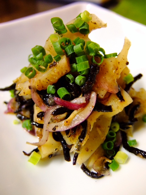 地味だけど、実に滋味深〜いサラダですよと、えぇ、「ひじきとれんこんの梅サラダ」!…太いひじきの海の風味、さっと茹でしたれんこんのシャキシャキとした歯ごたえ、梅干しを使ったさっぱりドレッシングでいただきます!梅の酸味が夏の疲れにちょうどいいですよ!ワタクシも大好き!ぜひぜひ前菜にどうぞ!(お)