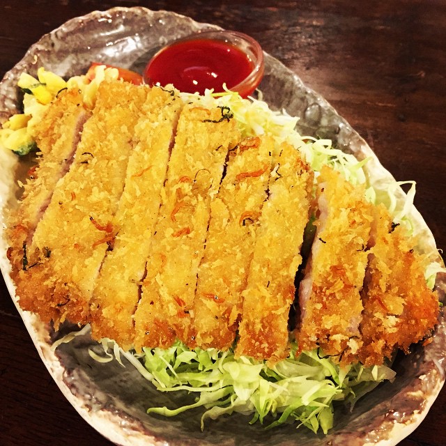 今日のワタクシokayanの昼賄いは…いや、昨日ちょっとフツカヨイ気味でおじやとかだったんで(苦笑)、えぇ、リバウンドとばかりにがっつり揚げものの!(笑)「しそちりめんとんかつ」!ピリ辛トマトの甘だれがグーッ!(お)