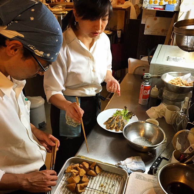 今夜は小さなご宴会をいただいておりまして、えぇ、季節のコースは秋刀魚のから揚げを盛りつけているところ…店長ミヤザキが手本見せ。(お)