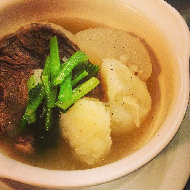 新作!牛すね肉の和風ポトフです。あっさり、優しい、晩秋にぴったりの煮込み料理!(麻)
