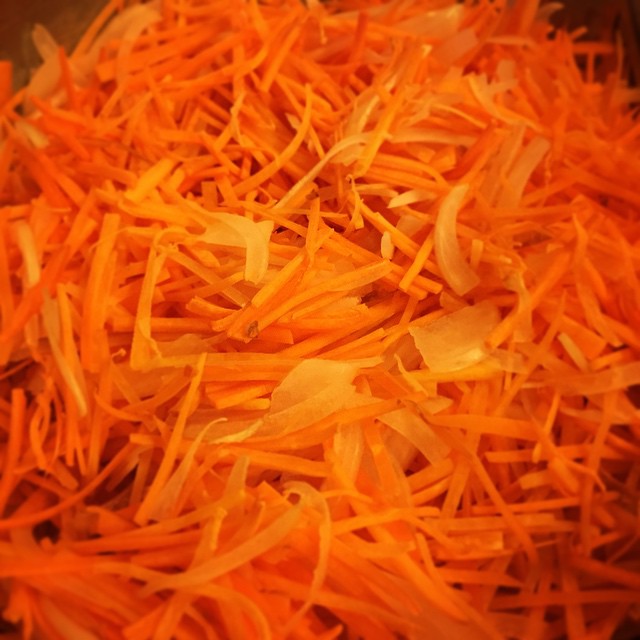 夜はちいさな酒の肴でお出ししておりますのが「にんじんのスパイスサラダ」!…細切り千切りにしたにんじんとたまねぎ…あぁ、それだけでもうおいしそうよねと(笑…気が早い)、ツナと合わせて…しゃきしゃきスパイスサラダ!(お)