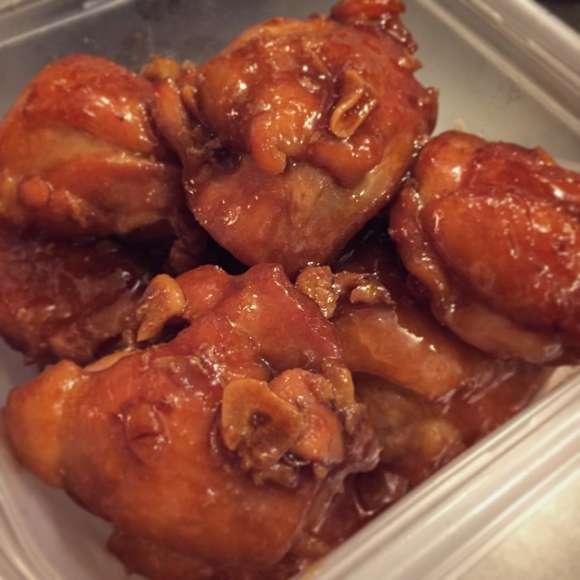 あー、キッチンのくぼさんがなにやらおいしそうなものを、次から次へとタッパーに!(笑)あぁ、てかとか飴色のお肉!ちいさな酒の肴メニューは「鶏肉のにんにく煮」!旨いに決まってる!(笑)(お)