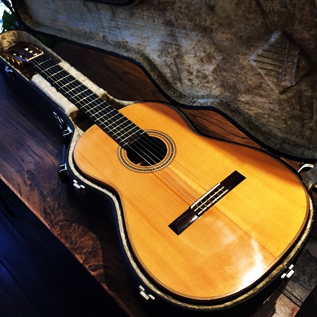 定休日、すっかり日も落ちてはきたけれど、お店に来てギター(と歌)の練習でも。愛用のガットギターは中古で買ったK.yairi、ちょうどワタクシがギターを弾き始めた頃に作られた1984年製。いい音がするすてきなギターです。(お)