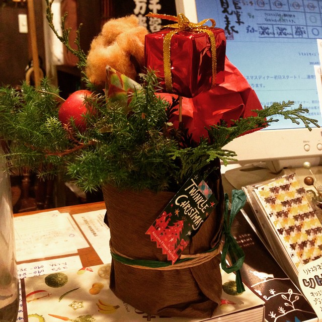 朝からおかやんがごそごそ。いつものお客さんからいただいた、クリスマスの花を更に可愛くアレンジメントしてくれました!麻ひもを巻いたり、赤い紙を添えたり。より華やか。さすがリトスタデザイナーおかやんでした。(さ)