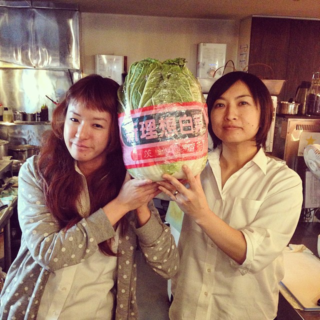 クボ太がすごい白菜を仕入れて来ました!その名も新理想白菜!大きい!重い!大きさ比較のため、のだみと店長の顔の横で持ってみました。
