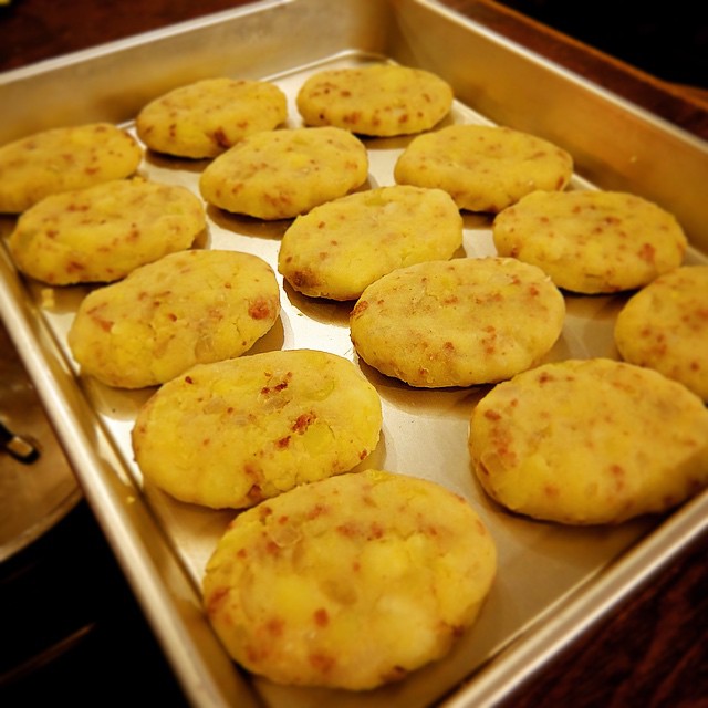 平べったくかたちを作って…そう!アレですね!新春は「ひばりスターレストラン」でも登場したアレ!今夜リトスタ登場予定!あつあつにビールが大変よく合いますな!(笑)(お)