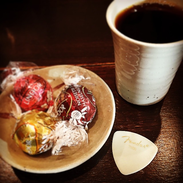 あー、先日のライブが終わって以来、ギターを、手にするのはもっぱらまほろばブレイクの時だけという(苦笑)、えぇ、でもこのfenderのうす〜いピックが思いがけず手に馴染むようで、目からウロコ(笑)。お茶請けはチョコレート。ごちです!(お)