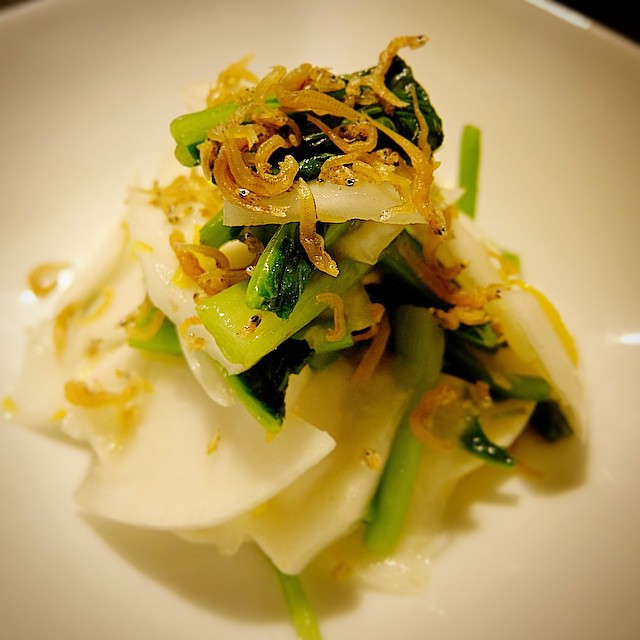 あー、金曜の夜、相変わらずのんびりスタートな当店ですが、いやいや今夜の前菜、さっぱりサラダは「かぶの浅漬けとじゃこのサラダ」!やさしいかぶのおいしさとカリカリに炒ったじゃこの旨味、柚子で冬の風味を添えて。(お)