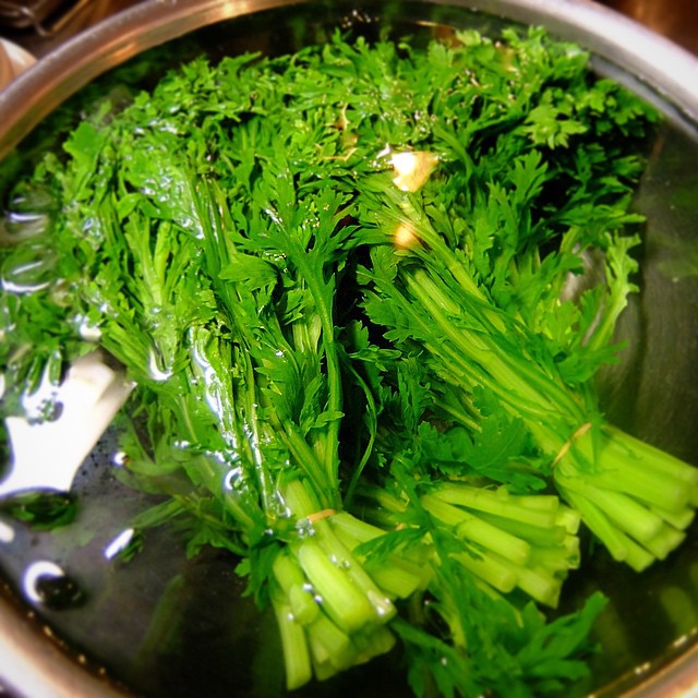 キッチンは緑の眩しい今日の午後…さっと茹でして氷水で締めて…先ずは春菊!ごまあえになりますよ!(お)
