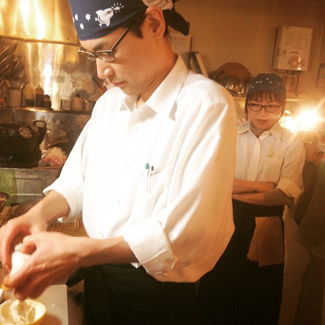 クボ太の季節がやって来ました!故郷の高知から送られて来たという名物、文旦を、ムッキーちゃんでササーッと剥いてくれます。クボ太が一番かっこ良く見える瞬間は、ムッキーちゃんを使ってるとき!とひょうばんです。後ろでは今夜の助っ人、はま子先輩が見守っていますよー(麻)