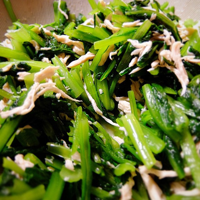 夜の小さな酒の肴メニューはみずみずしい「小松菜と蒸し鶏のからしあえ」!…いや、仕込み段階ですでにおいしそうですねと(笑)、みどりがまた眩しい春ですな!(お)
