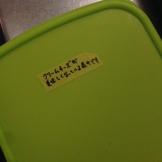 タッパの蓋に、タッパの中の様子となべさんの願いが貼ってありました(^_^)。癒しキャラ・なべさん、なかなかな魅力をお持ちですね。(うめ)