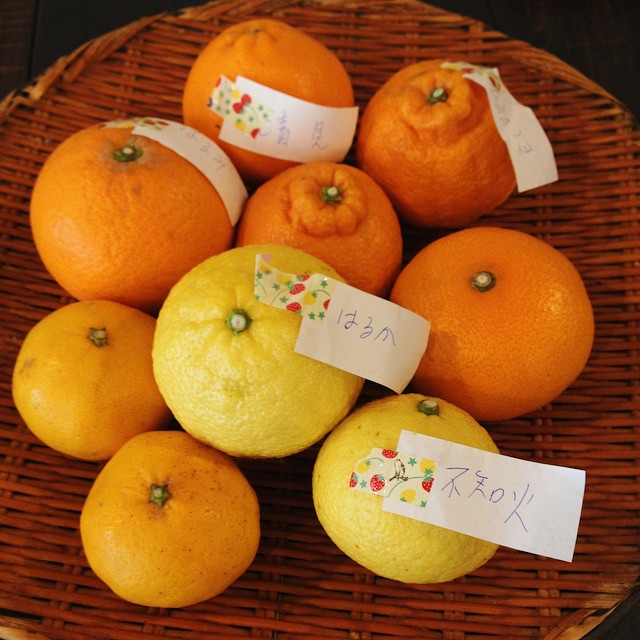 お客様からいろんな柑橘いただきました。私が小さかった頃は柑橘といえばみかん、八朔だったのが、いま一体何種類くらいあるんでしょうか。名前を貼ってくださったので覚えられるチャンスです。食べ比べが楽しみです。いただきます!ありがとうございます。(うめ)