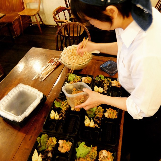 という訳で、今日のティタイムはお休みして当店二度目のお弁当作り!10人前!店長ミヤザキ、盛り付け中!(お)