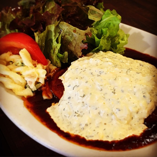 あー、そんでウメさんのさっぱりヘルシーなハンバーグに続いては、ワタクシのこってり濃厚高カロリーな賄いハンバーグを(苦笑)。いや、こっちは賄いのみならず、タルタル別添えを追加することで可能です!いっぺん試してみて!求む!挑戦者!(笑)(お)
