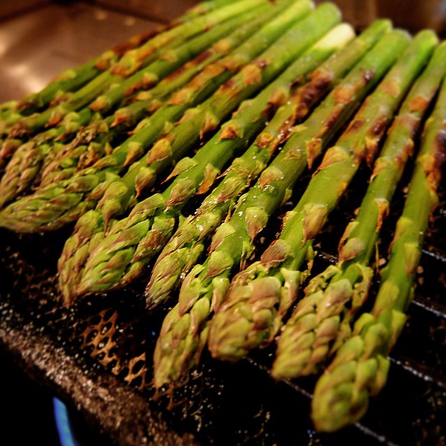 さてさて日曜日、アスパラのおいしい季節が続いておりますよ!と、今夜はシンプルに網で焼いて、やさしい味のだし汁でさっくり焼きびたし!初夏の前菜にうってつけ!(お)