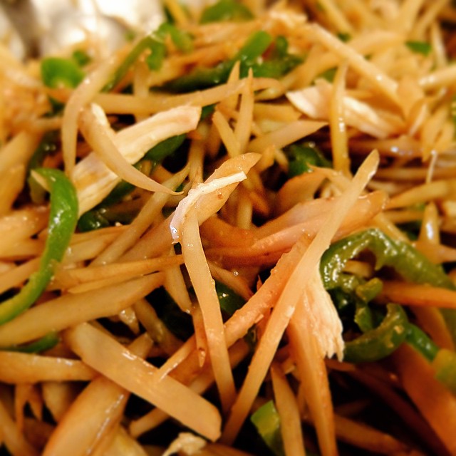 小さなメニューはワタクシの大好物!(笑)「ごぼうとピーマン、蒸し鶏のわさびあえ」!しゃきしゃきごぼうの食感と蒸し鶏の淡白な旨味、ピーマンの独特な風味がアクセント!ほんのりわさびが隠し味!あー、ビール持って来て!(笑)(お)