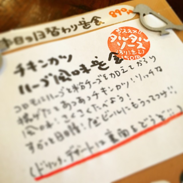 あー、日曜日。今日の日替わり定食は「チキンカツ・ハーブ風味定食」!…ってそこじゃなくてさと(苦笑)、えぇ、「おススメ!タルタルソース(別添え)150円」のスタンプ初登場!いや、この間作ったんですよと、単にそれがうれしくてアップしただけ(笑)。いや、今日の日替わり、タルタルソースおススメ!(笑)(お)