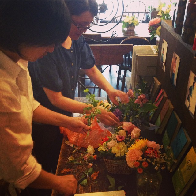 先週、11周年のお祝いで皆さんに頂いたお花を少しずつドライフラワーにしたり、アレンジを組替えたりと、店長&うめさん。ハッとするくらい見栄えのする組み合わせがあったりして楽しいですね。ご来店の際は、目で楽しんでくださいね。(ぬ)