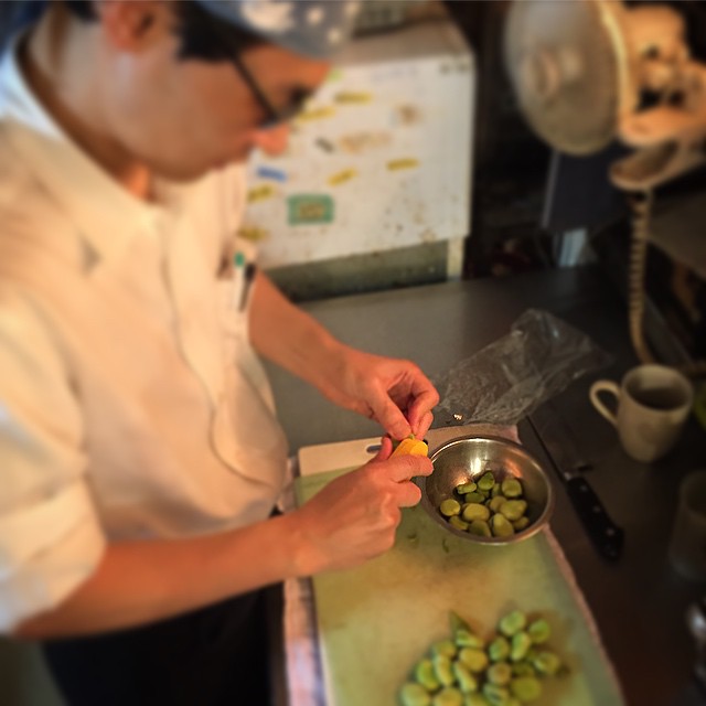 あー、以前もお伝えしましたが、えぇ、くぼさんと言えばムッキーちゃん、ムッキーちゃんと言えばくぼさん…と、えぇ、柑橘の皮を剥くためだけに生まれてきたような小さなキッチンツール、それがムッキーちゃんな訳ですが、この季節、そら豆の下ごしらえは中の薄皮剥きにうってつけ!…ということで、やっぱりくぼさんの出番です!(笑)そら豆ととうもろこしの白あえ、メニューインですよ!(お)