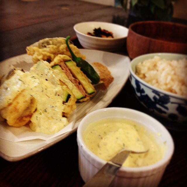 今日の日替りは「なすとズッキーニのはさみ揚げ」でした。カレー塩で食べるのですが、今日お客様がタルタルがけに挑戦されてたのを見て私も早速!美味しい!、、、美味しいけれど、はさみ揚げはやっぱりカレー塩で食べたほうがビシッと味が決まるようです。これからもいろんなメニューでタルタル挑戦したいと思います!(うめ)