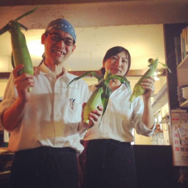 お馴染みのお客様から、あきる野で作られている美味しいトウモロコシをいただきました!ミエルコーンという品種です。ありがとうございます!と、変に意識した笑顔のキッチン二人組であります。(麻)