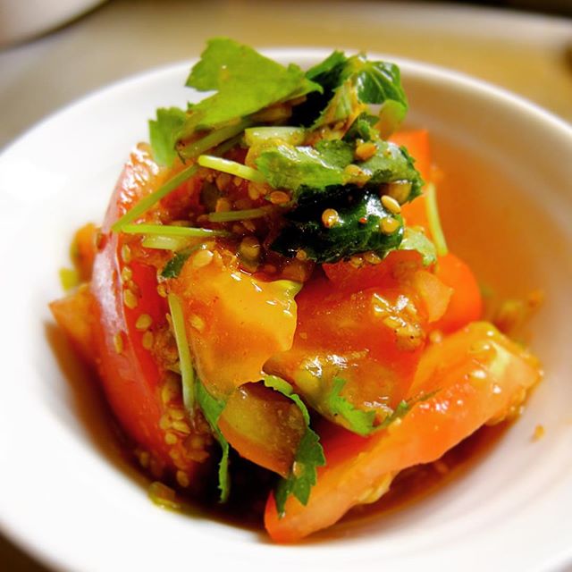 さてさて、しとしと梅雨空…あー、こんな日はさっぱりリコピン!「フレッシュトマトのナムル」がイイネ!にんにく生姜に長ねぎ薬味にごま油の香り!旨口ナムル!さっくり前菜にどうぞ!(お)