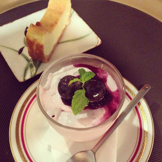 季節のデザートはブルーベリーのレアチーズケーキ、オススメです。今年摘んだ三鷹産ブルーベリーが無くなり次第の終了ですよ♪お早めに〜(ぬ)