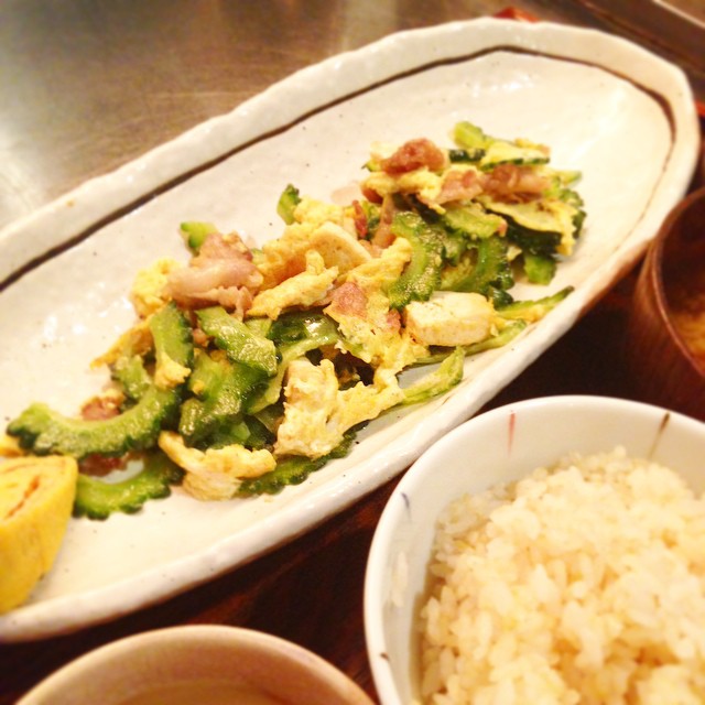 今日のまかないはゴーヤチャンプルーです!具はゴーヤ、豚肉、豆腐、卵とオーソドックスで、味付けもごま油に塩だけと超シンプルです。だからこそそれぞれの具材が引き立ちます。主役のゴーヤは程よい苦味と甘みで、そこにジューシーな豚肉と豆腐、そしてだし入りのふわふわ卵が全体を優しくまとめてくれます。ヘルシーなので夏バテ気味でもぺろっと食べられちゃいますよ。夏の疲れた体にいかがでしょうか(*^o^*)(コジ)