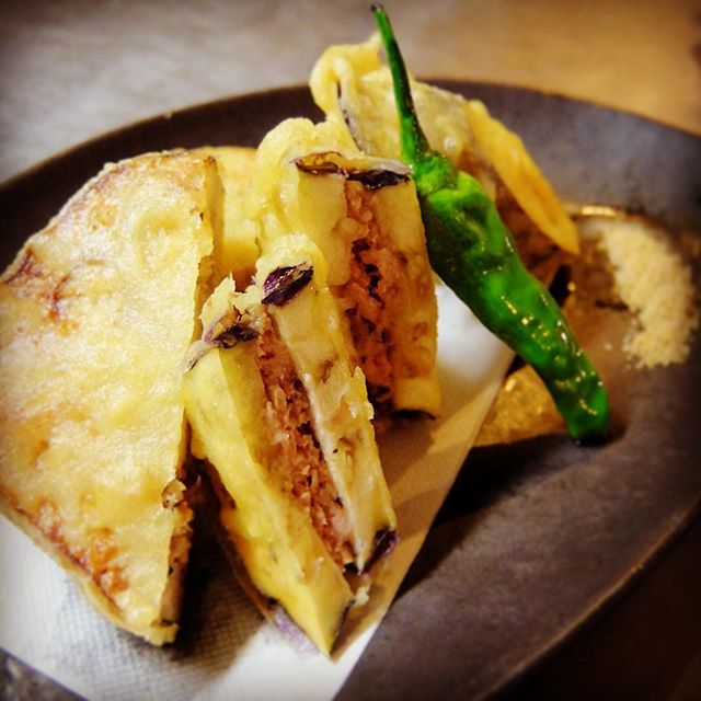 ランチではおなじみ…って、だから逆に写真撮りそこなってたりするんですよね(笑)。ひき肉あんを挟み込んでふたつのおいしさ!しゃきしゃきれんこんにジューシーな茄子、あつあつをカレー塩でどうぞ!(お)