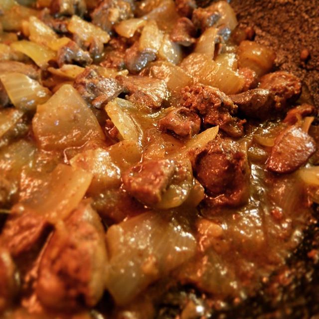 おなじみ人気の「自家製レバーペースト」…くつくつくとキッチンスタッフのくぼさんがフライパンで炒め煮た鶏レバーにたまねぎ、バターとにんにく…このあと生クリームと一緒にフードプロセッサ、その塩梅がプロの仕事なのでありますな!(もちろんワタクシにはできませんとも!…苦笑)(お)
