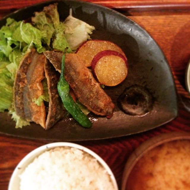 今日のまかないは、さんまの香り揚げです。しょうがとにんにくとお醤油で味付けたさんまを揚げて…と、これはご飯がすすむ!ということで、ごはんは多めに盛って。一緒に揚げられたサツマイモも美味しくて、まいりました。(な)