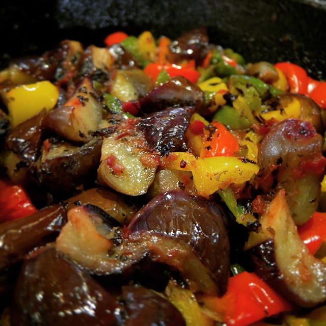 昨日通勤途中はうちの大家さんとも仲よしの町の小さな八百屋さんで買ってきたピシッとと酸味の効いた梅干しで作った梅オイル蒸し!茄子にパプリカ、ピーマンと野菜がざくざくおいしいですよ!(お)