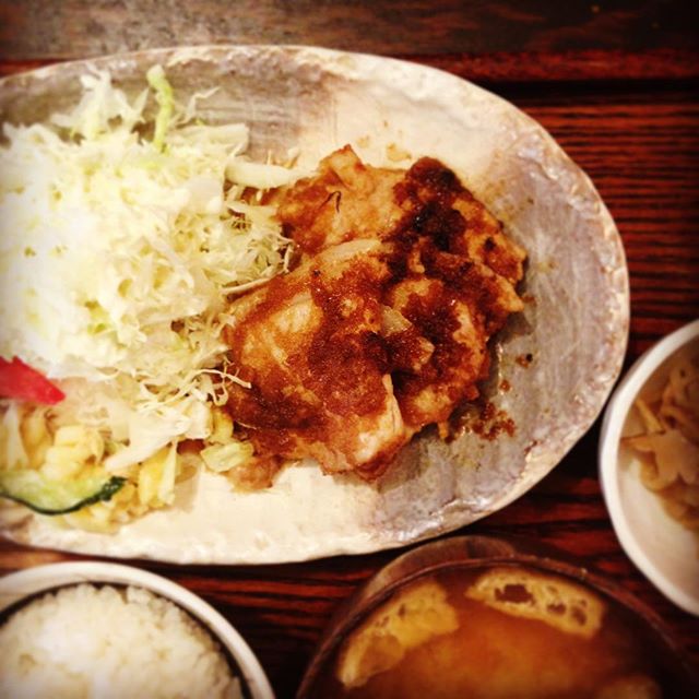 今日のまかないは、豚肉の香味焼きです。そのまま食べて、ご飯と食べて、キャベツをくるんで食べて。は〜、おいしい!キャベツにかかっている自家製豆乳ドレッシングはやさしい味で、香味焼きによく合うんです。次はいつ食べられるかなー。(な)