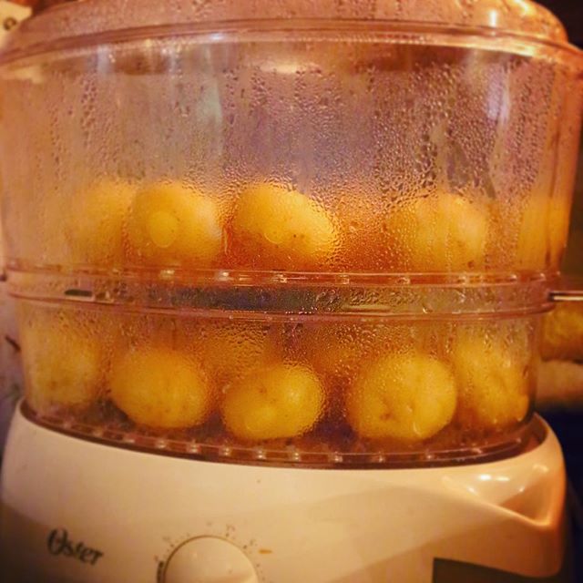 ころころ小さな新じゃがを蒸し器で一気に加熱!…って、昨秋導入した電気式蒸し器、送料込みで850円はすでに完璧に元が取れておりますね!(笑)(お)