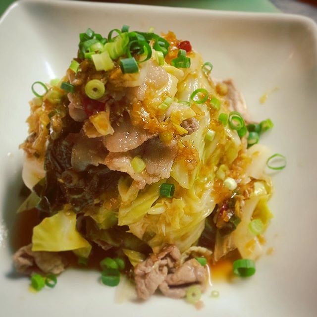 あー、今日はあめでしたからね、ちょっと冷えましたよねと、今夜のあったかメニューは「春キャベツと塩豚の酢蒸し」!塩豚の旨味に春キャベツのやわらかいおいしさ!蒸したてあつあつに特製中華香味だれがうまい!おススメですよ!(お)