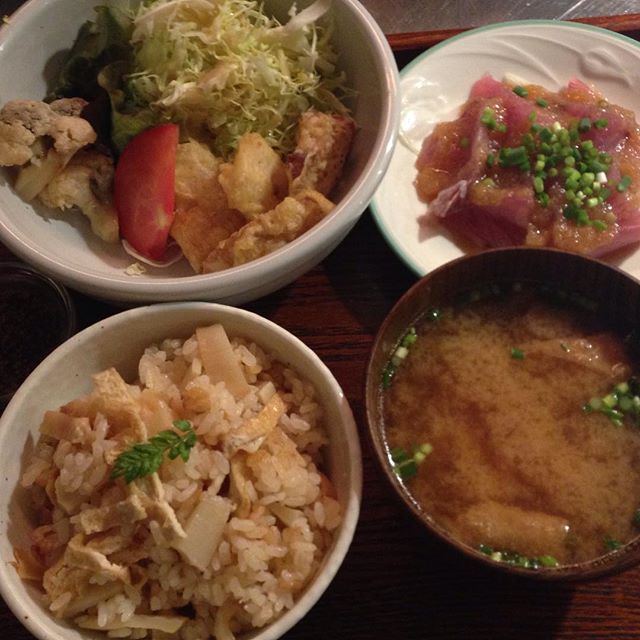 今日は貸切のご宴会のまかないメニューです。ブリの和風カルパッチョ、トルコ揚げ、あちゃら漬け、筍の炊き込みご飯。幸せな夕飯となりました〜。先月より助っ人としてたまに入っています。よろしくお願いします!(ふ)