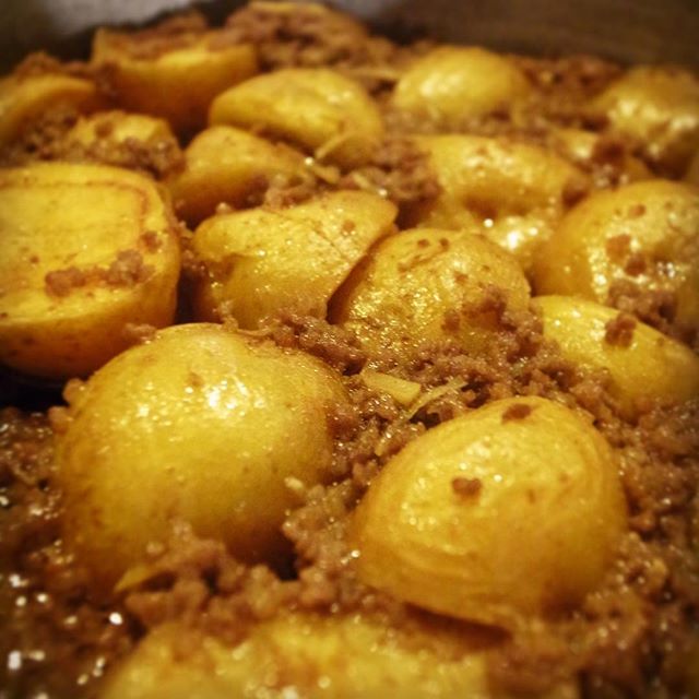 大鍋にはこっくり新じゃかさっくり一度揚げしてひき肉といっしょに甘辛〜くこっくりこっくり煮えてます!これはおいしそう(笑)(お)