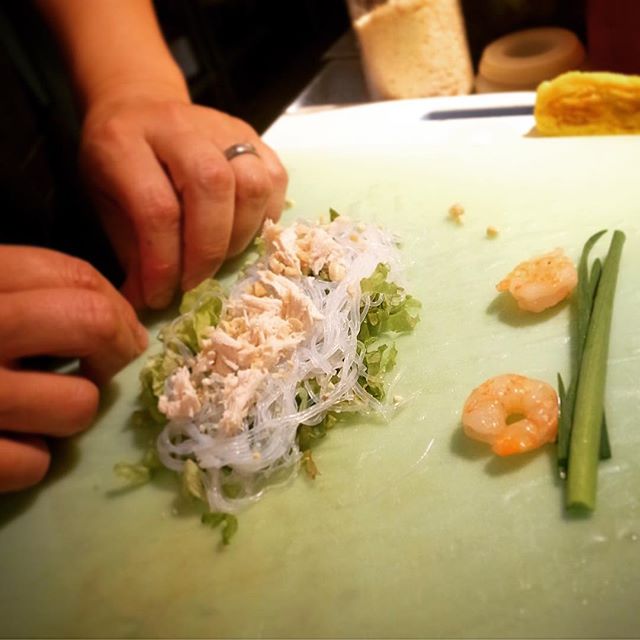 さてと雨の土曜日!今夜の目玉はマボロシメニューの「ベトナム風生春巻」!…久しぶりに巻きますよ!と店長ミヤザキ、具はサニーレタスに春雨、蒸し鶏とエビにニラ…離して皮の上に並べたら(お)