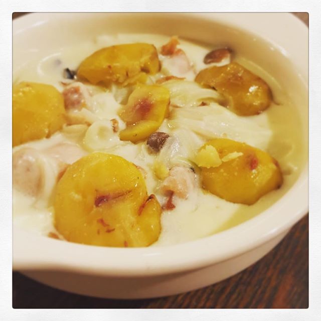 今季初グラタンは栗ときのこ・チキンのグラタン!栗をたっぷり入れちゃったぞ!秋の味覚をお楽しみください〜(麻)