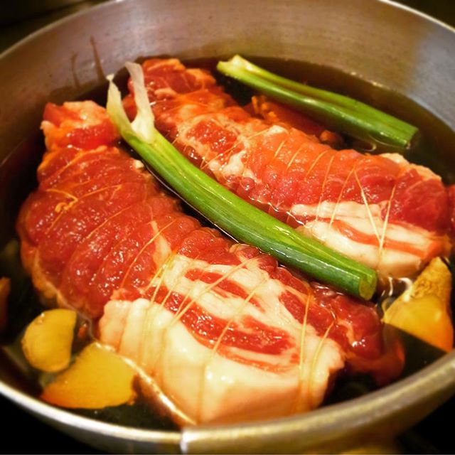 さてさて店長ミヤザキ、凧糸でぎゅっと巻いた豚肉カタマリを青ねぎや生姜といっしょに煮込みますと…(お)